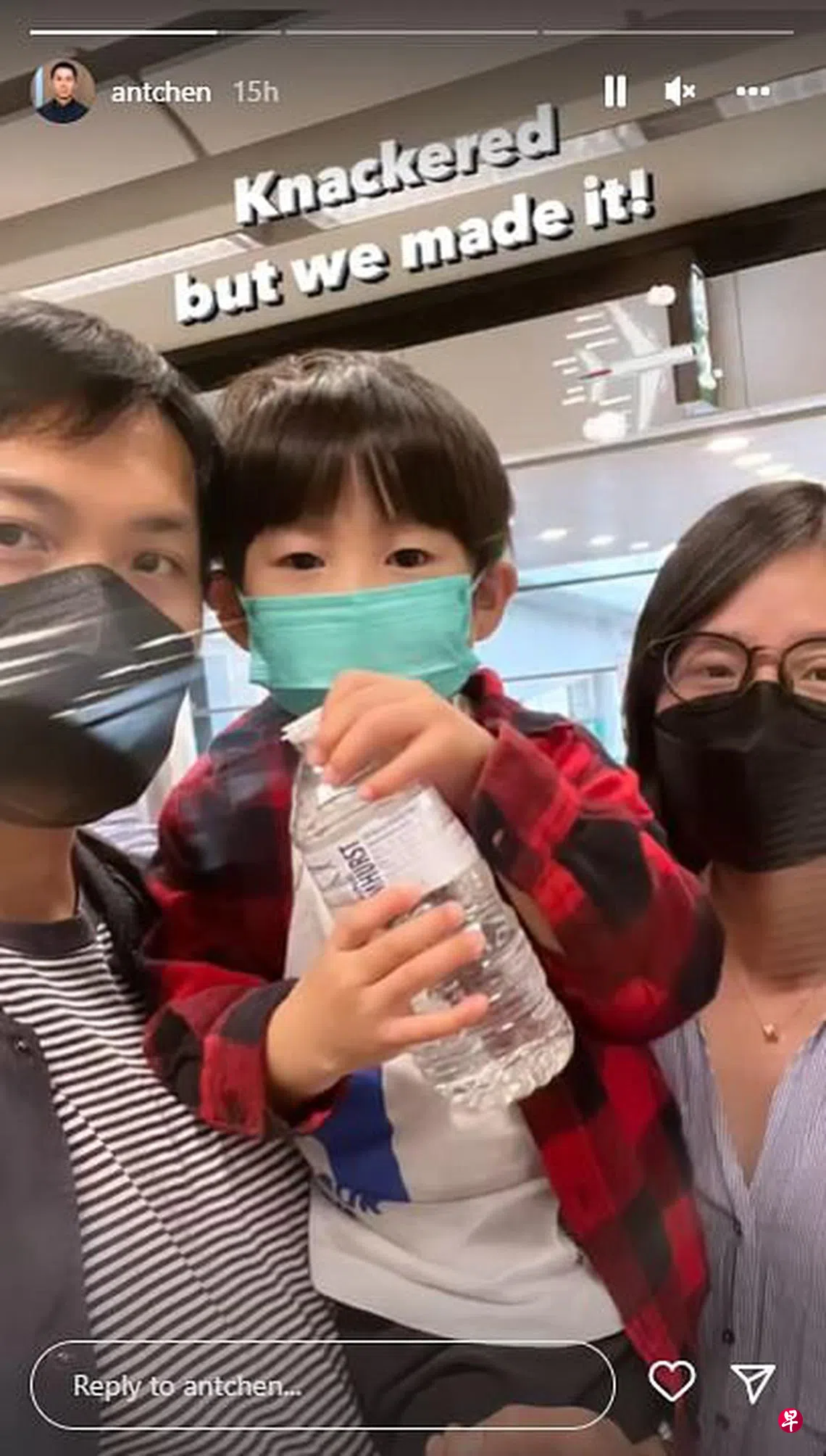 陈哲艺在Instagram限时动态上传三张图片,包括在一家三口在机场戴着口罩的合照、他的宝贝儿子与一堆行李的合照,以及太太严扬与儿子坐在酒店沙发闭目休息的照片,最后一张照片上则标上“Quarantine”(隔离)。