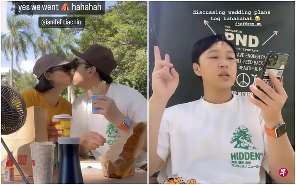 星期天(14日)陈凤玲上传户外野餐的视频,透露两人已经开始讨论婚礼事宜。徐鸣杰曾在接受媒体访问时透露希望能在三个月内举行婚礼,算一算时间真的不多了哦。