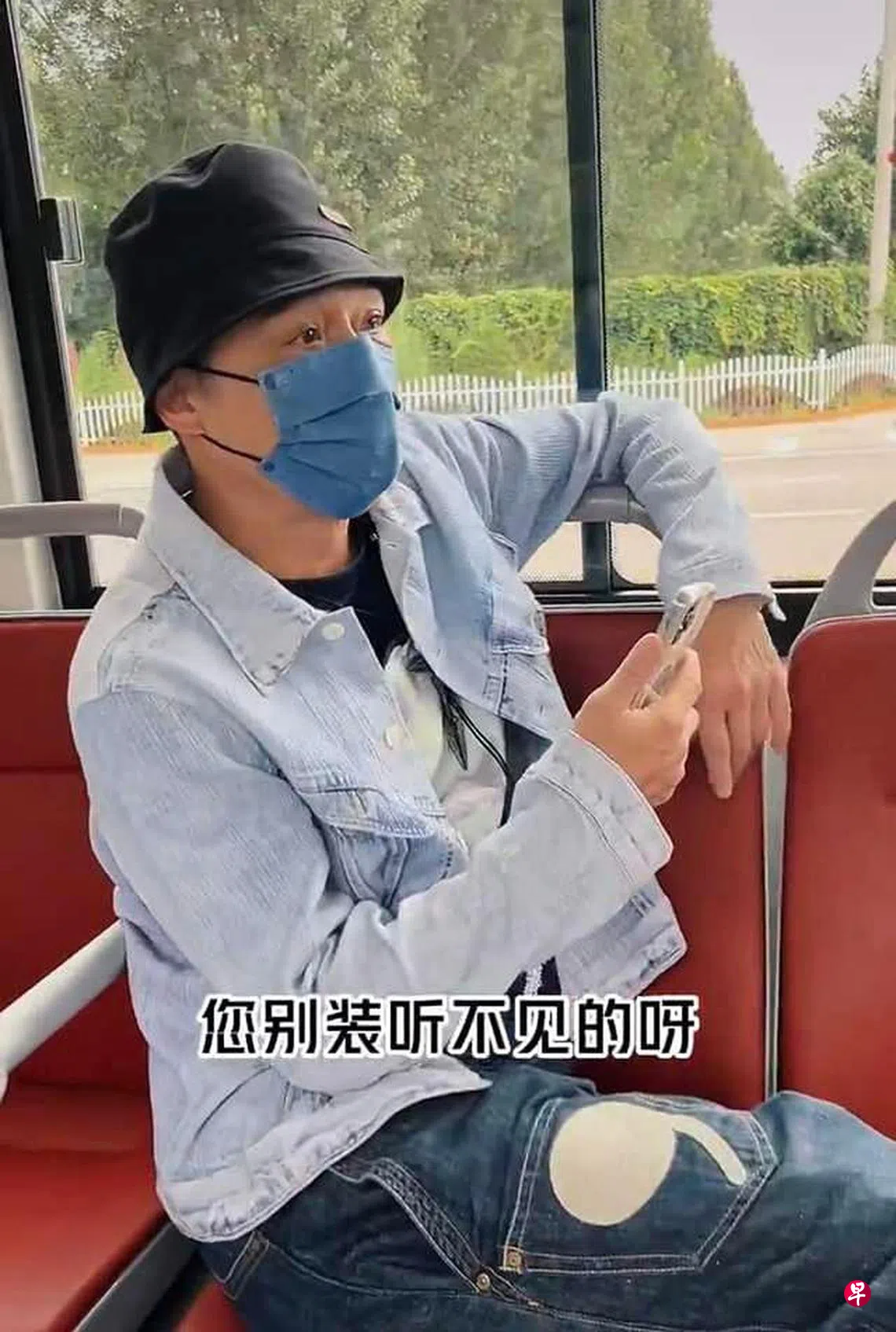 吴镇宇日前在抖音发视频,身穿牛仔服装、头戴小圆帽、脸戴口罩的他,在中国大陆上了一辆巴士,直接坐在“老弱病残孕”的专属座位。或许因为他装扮年轻,行动便捷,又被帽子和口罩遮住半张脸,看起来不像老人,所以马上引起对面座一个乘客的质疑。