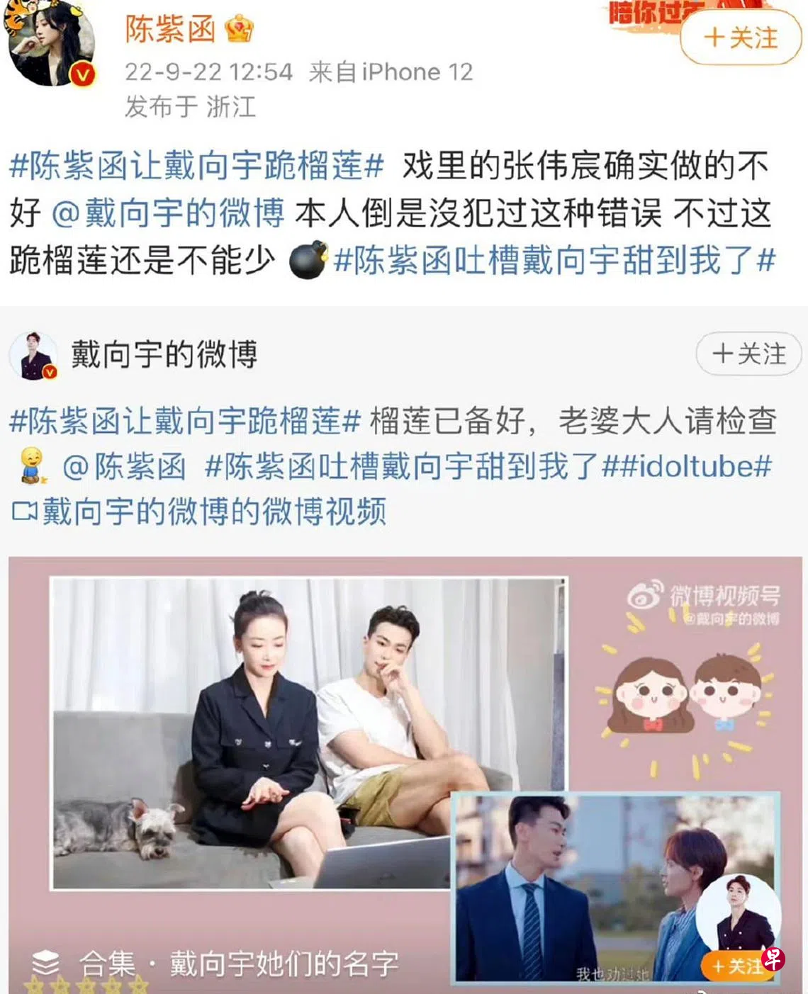 戴向宇22日中午在微博上传一段跟太太陈紫函一起追看《她们》的短视频,写下“榴梿已备好,老婆大人请检查”,并标注太太陈紫函。事后陈紫函回复:“戏里的张伟宸确实做得不好,戴向宇本人倒是没犯过这一种错误,不过这跪榴梿还是不能少。”