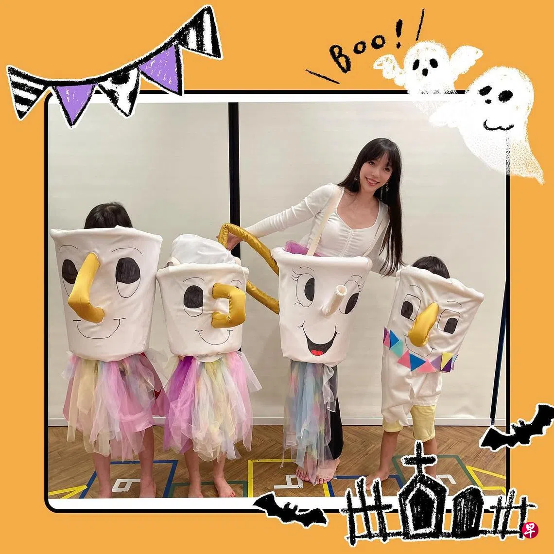 李靓蕾与孩子们制作万圣节装扮,她将自己变装成迪士尼卡通《美女与野兽》(Beauty and the Beast)里的茶壶太太,孩子则是小茶杯,发文写下“万圣节快乐 from 茶壶太太, Coffee? tea? Me?(咖啡?茶?我?)”