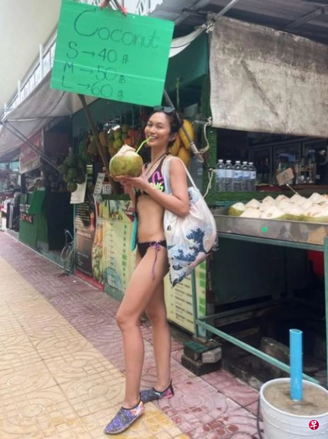 戚玉武和白薇秀不久前带着一对子女到泰国普吉岛旅游。白薇秀在IG分享一张自己穿着比基尼在路边摊喝椰子水的照片,贴文说:“在新加坡觉得椰子好贵不舍得喝,去到普吉岛几天也没舍得喝,后来在Phi Phi Island看到这个招牌才记得是这里的土产……马上来粒大的!”
