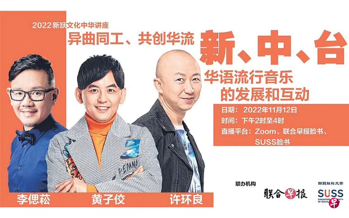注:若无法通过此页面观看直播,请点击这里。 由《联合早报》与新跃社科大学联办的“新跃文化中华讲座”今年邀请到三位知名音乐人和乐评人——黄子佼、许环良以及李偲菘担任主讲嘉宾。 1980年代末,新谣一代的音乐人走出新加坡,融入华语流行音乐的大浪潮之中。2022年的今天,新加坡音乐人与中国、台湾同行共同以音符、文字和歌声,为华人世界唱出一曲曲动人心弦的流行歌曲。三地的华语流行音乐和音乐人有哪些共同与不同点?今日华语流行音乐又由谁领导风潮?听三位在三地经营音乐事业的嘉宾分享这些年来的观察与独特见解。 请看《联合早报》采访报道,了解更多讲座内容和详情:https://bit.ly/zb-mandopop