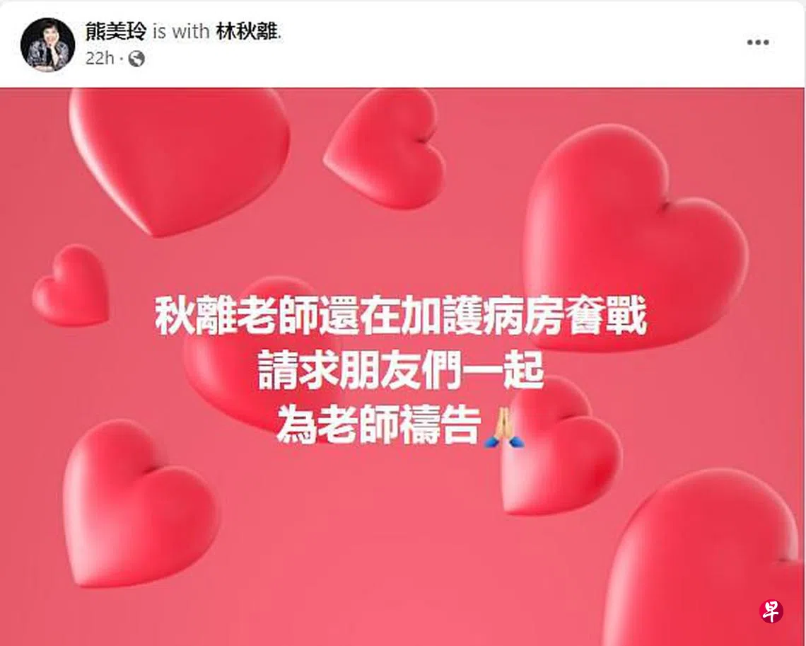 62岁台湾知名作词人、唱片制作人林秋离,曾当台湾海蝶音乐公司董事长,海蝶发掘了新加坡歌手陈洁仪、阿杜与林俊杰,三人到台湾发展都和他有过师生情,通过合作产生《江南》《天黑》《曹操》《不为谁而作的歌》《第二天堂》《心痛》《逼得太紧》《伤心》等名曲。2日(星期五),林秋离的妻子熊美玲透露老公在加护病房奋战,“请求朋友们一起,为老师祷告”,让许多亲朋好友以及粉丝纷纷涌入社媒打气。