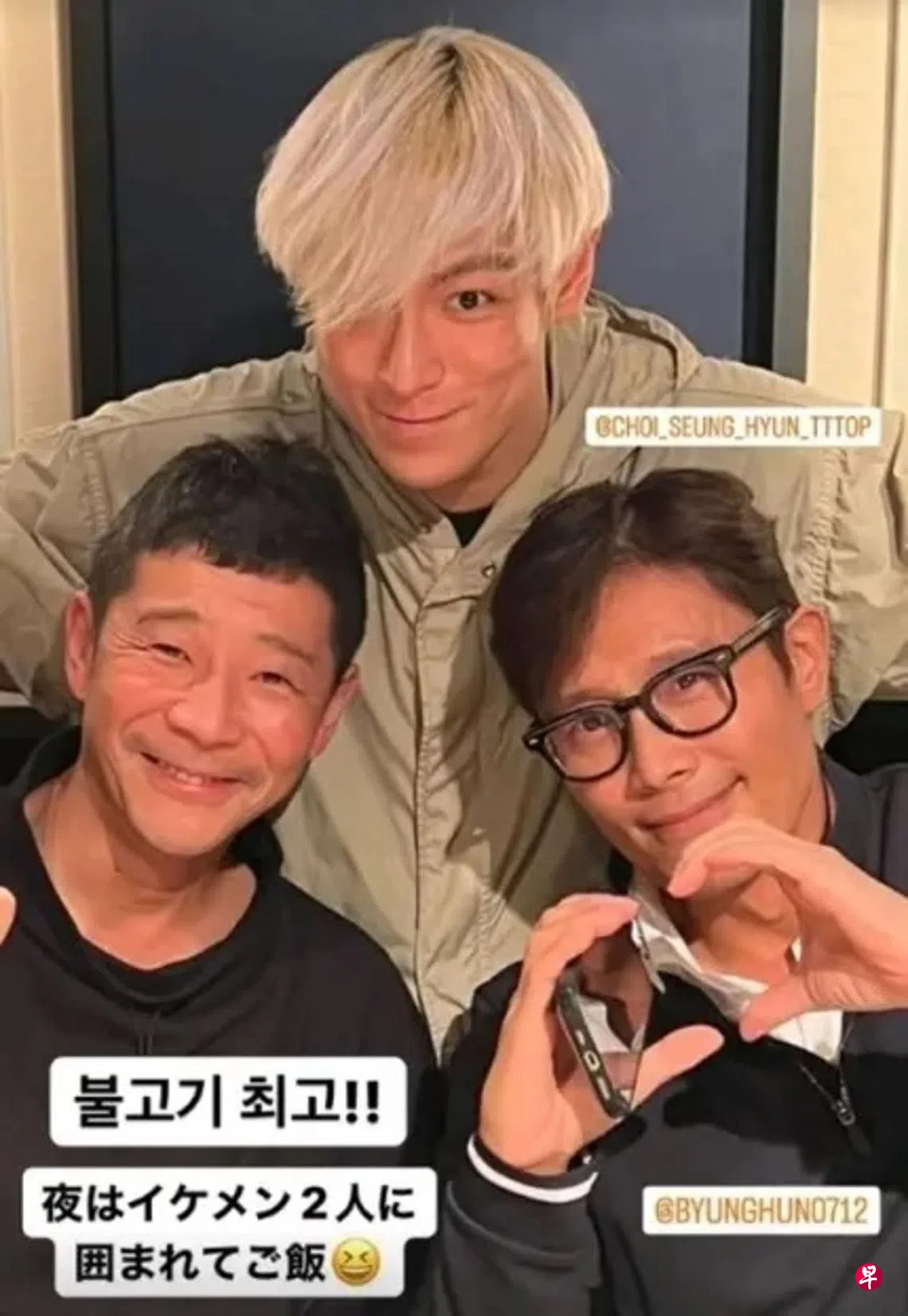 T.O.P离开前东家YG娱乐后转行当艺术家,并与热爱收藏艺术品的前泽友作私交甚笃。前泽友作今年9月初在IG上传与T.O.P、李炳宪合照,还调皮地说“被两位花美男包围,一起吃晚饭”。就不知李炳宪是否也是登月人选之一?