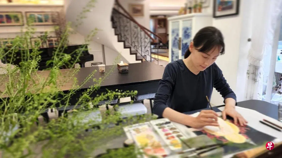 照片中,梁洛施端正坐在桌前提笔画画,身后有一个气派的黑色大长桌。照片中也可见室内有一个白色旋转楼梯,楼梯下方有黑色演奏型钢琴,豪宅内部大多是白色墙面,家具多是黑色系,墙上挂有数幅艺术画。她绘图的座位旁边有一扇落地窗,隐约可以窥见室外。