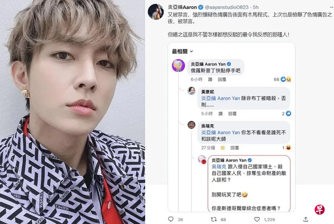 他也贴出一个截图,显示他在某战争相关的贴文下留言“俄罗斯普丁快点停手吧”,引来网民呛声“你怎不看是谁死不谈和呢大师”。炎亚纶原想回怼,不料却遭禁言,无法送出这番回应:“跟入侵自己国家领土、杀自己国家人民、掠夺生命财产的敌人谈和?别开玩笑了吧!你是斯德哥尔摩综合症患者吗?”