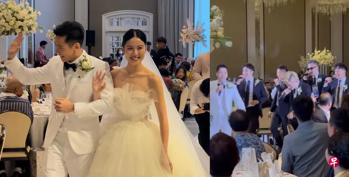 《新兵正传》“Ah Boy”陈伟恩和医生女友郑主恩星期一(12月26日)在莱佛士酒店举行婚礼,宴请250人。新郎率领兄弟团叶荣耀、林俊良、吴清樑、张智扬和包尚泽走进宴会厅,六人高唱电影《狮神决战》的主题曲《我们的故事》,掀起婚礼第一个高潮。
