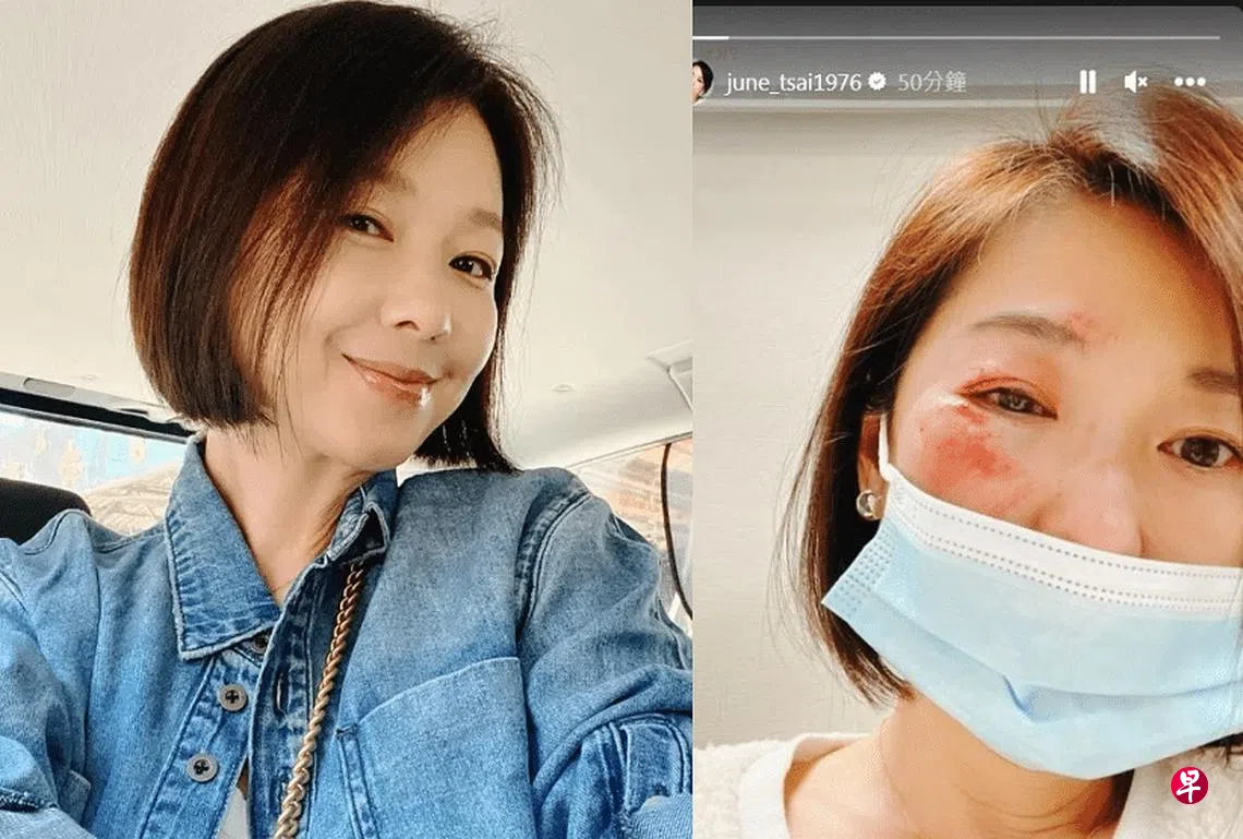 六月则在社媒贴出自己出受伤的照片,她的眉头、脸颊都有红肿挫伤,眼睛周围肿起还有一道血痕,眼球也可见血丝。她透露,1月7日去露营,因为不熟悉地形所以受伤,加上皮肤过敏,“这两天已经肿到眼睛睁不开”。但是她说会继续工作,将戴上墨镜录影。