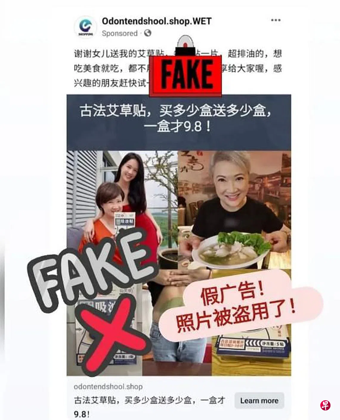 本地知名女星洪慧芳与爱女郑颖的照片被盗用来卖“艾草贴”,洪慧芳说:“太无良了!千万不要上当!”