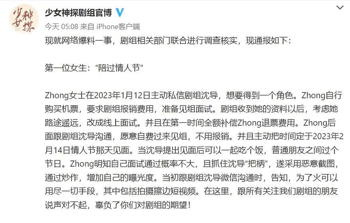剧组10日早上再发文,表示已对网络爆料进行调查核实。针对导演要求一起过情人节,剧组公开截图,透露是该女子Zhong主动私信沈导,希望得到一个角色,并提议在情人节见面。剧组发文中说,沈导提到见面后可以一起吃饭,女子却趁机截图炒作,以增加自己的曝光度。至于录音档,剧组也认为是爆料女子月亮弯弯“诱导谈话,恶意抹黑剧组。