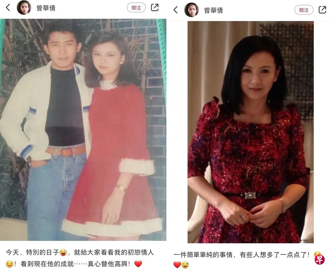 照片中,曾华倩身穿红色连身裙,梁朝伟则一身休闲装扮,两人都非常青涩。曾华倩配文写道:“今天,特别的日子,就给大家看看我的初恋情人!看到现在他的成就……真心替他高兴!”
