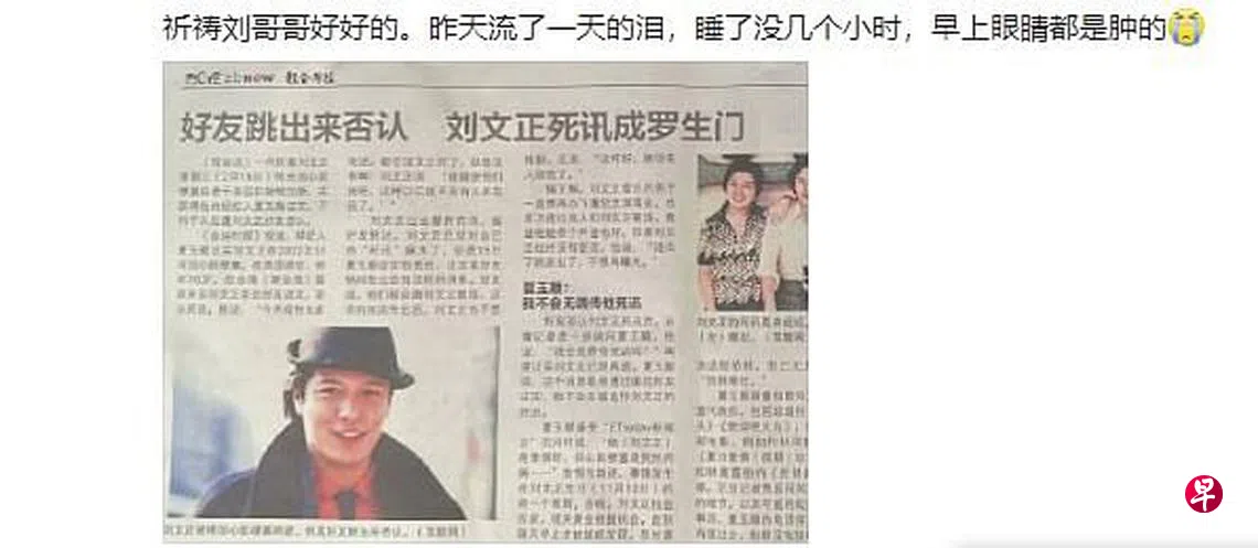 1)刘文正的新加坡友人有刘文正所授权的歌曲版权,也是他近期还有联络的人。新加坡友人透露,过世消息传出后他也很错愕,因为前一天他才跟刘文正通过电话。当时刘文正告诉他:“这两个月都在传我过世的消息,就让他们传吧,这样更好,再也没人会来烦我。”