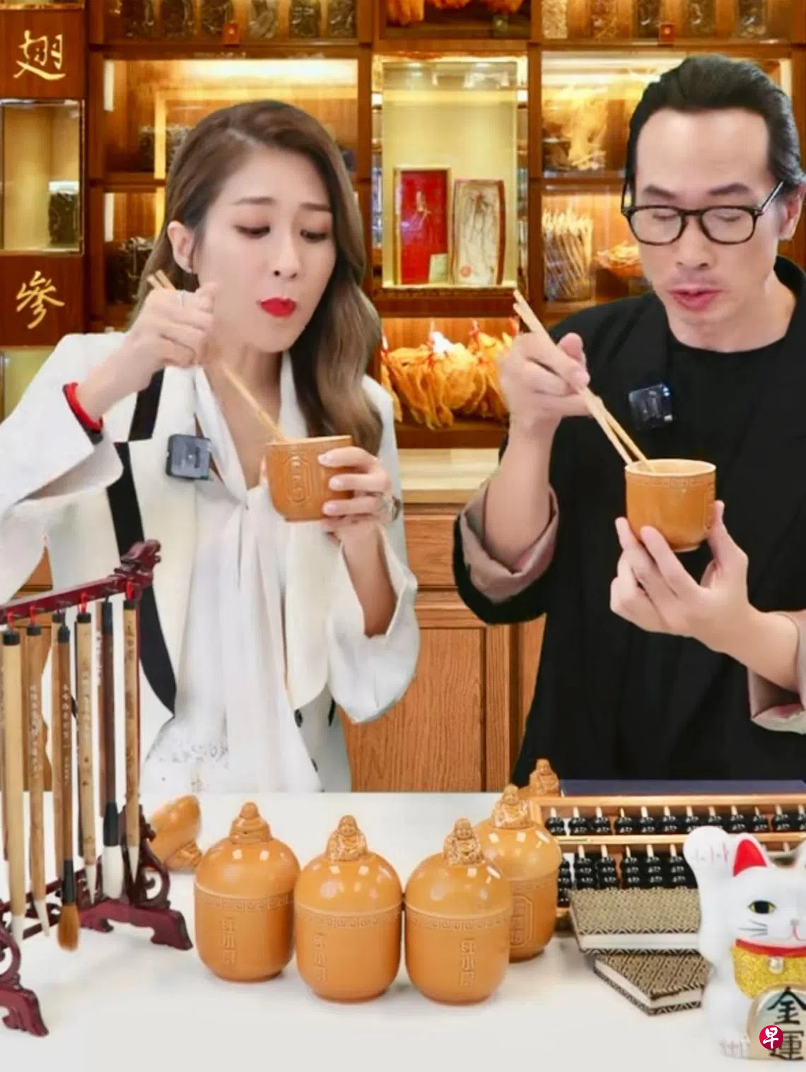 有趣的是,陈豪几乎在介绍每一样食品时都会在镜头前试吃,一口气吃了鲍鱼、佛跳墙、叉烧包、曲奇和蛋卷等,还放话“我吃下去的肯定就是好吃的”,视帝第一次直播带货果然够专业!