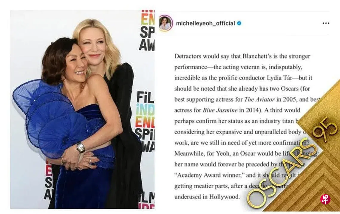 颁奖典礼举行在即,杨紫琼星期二(7日)在IG分享了时尚杂志《VOGUE》里头一篇标题为《我们已超过20年没有非白人演员获得最佳女主角了,2023年会改变吗?》的文章。该篇文章内容是针对杨紫琼的最大劲敌澳洲影后姬蒂班查(Cate Blanchett),指出她已经拿过两座奥斯卡奖座,再拿第三座无疑可证明她的地位,但她已有许多无人能及的作品,还需多证明吗?