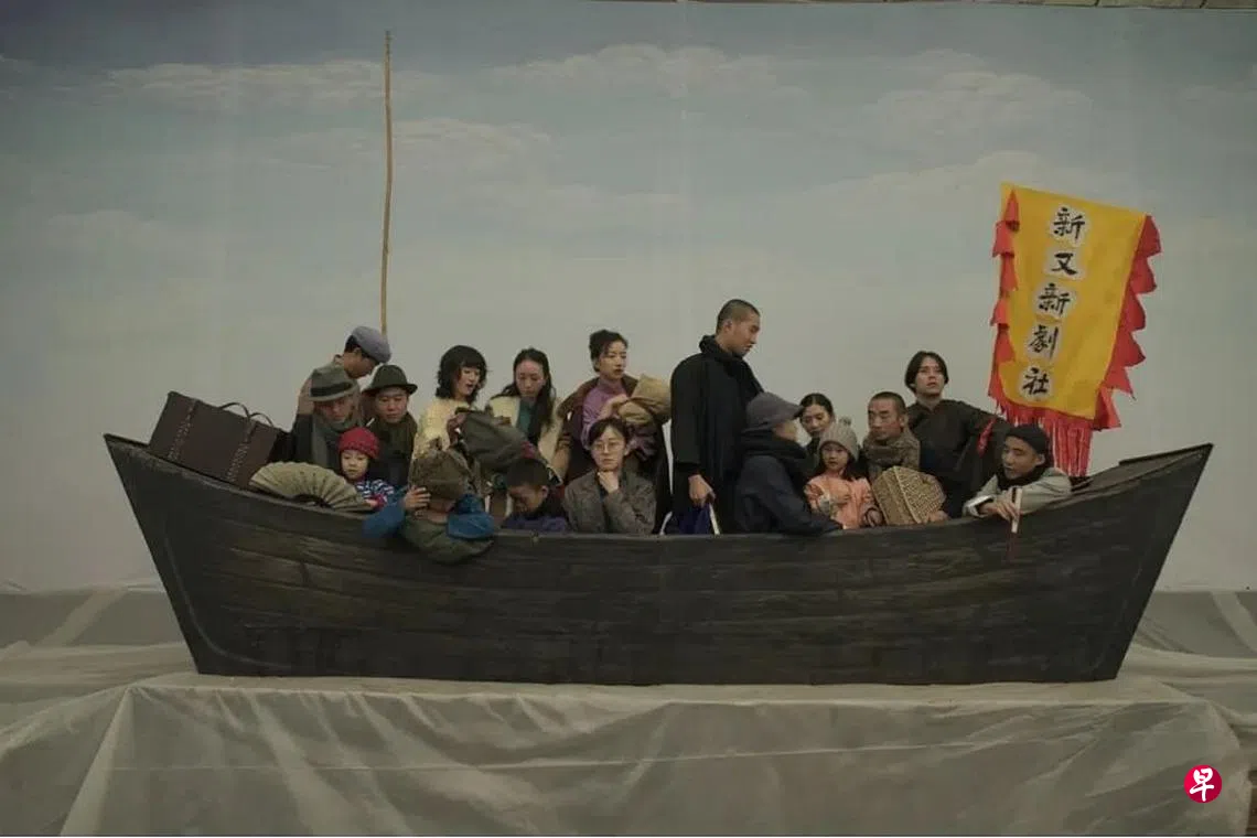 土法炼钢?剧组用废弃篮球场搭个马戏布棚当摄影棚,跨越70年的各个布景都是很省钱的舞台剧“风味”,有用画的,有用卡片道具的,压根儿没在怕看起来很假、很侷促。如国共内战后期,剧团暂避台湾时,画面是全团人站在搖晃的假船上,地面抖动的白布象征海浪;战争场面则是在立体舞台模型前,士兵抬着伤员的画面。部分人物造型及角色塑造参考川剧丑角(传统川剧确实是以丑角居多,邱导的祖父和戏里男主角也演了一辈子丑角),却又相对写实。一些人物众多的舞台剧/地方戏曲,会让某些演员在不同场面换造型,一人分饰多角,这一招《椒》也用上了。