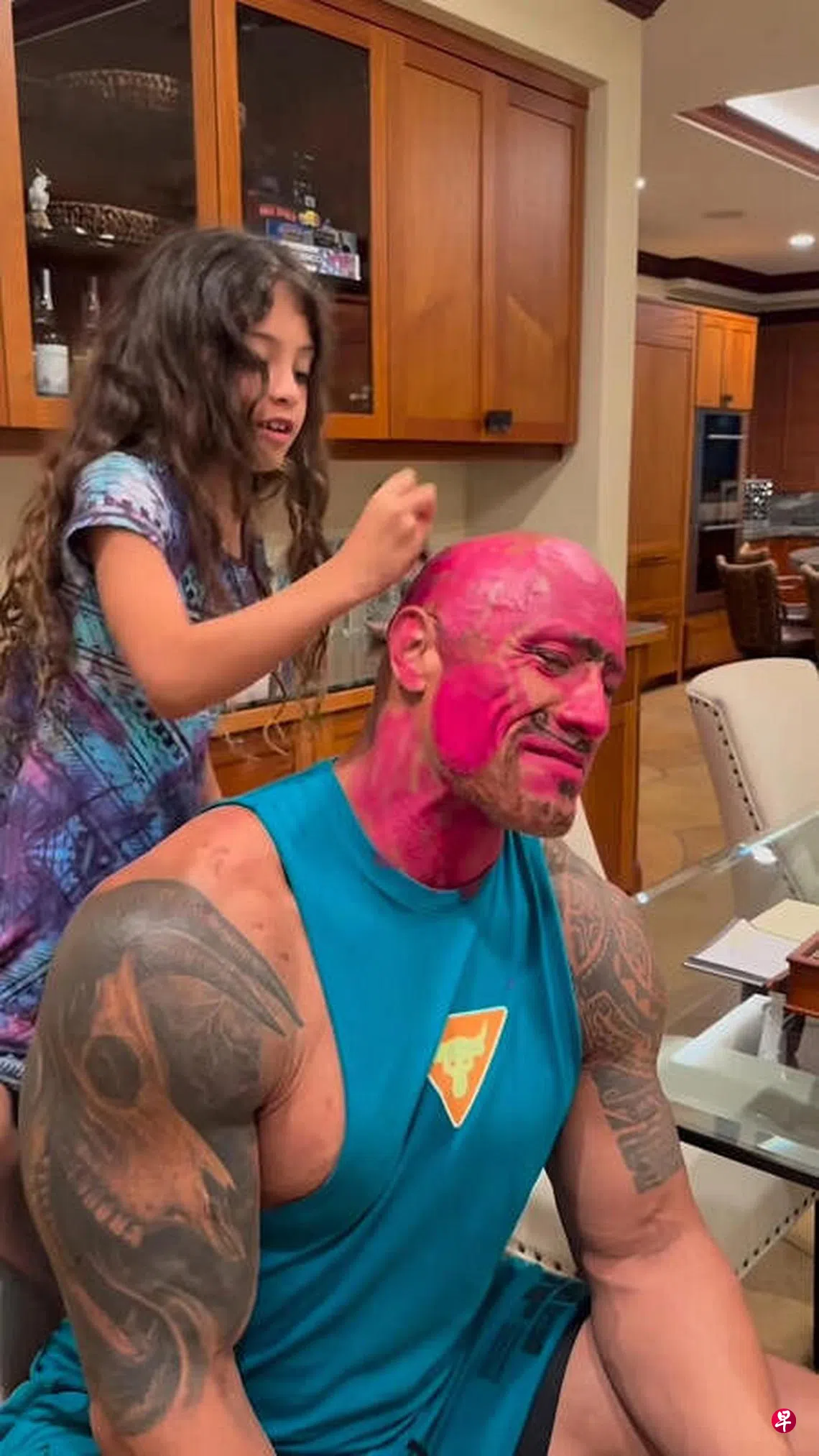 (好莱坞讯)《黑亚当》男星巨石强森(Dwayne Johnson)近日在IG分享影片,只见他和女儿在家中互动,女儿用口红将他的光头与脸颊涂成粉红色。