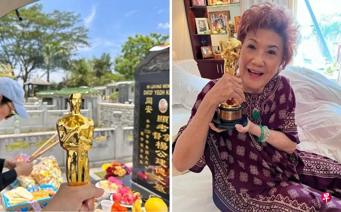 (综合讯)奥斯卡影后杨紫琼载誉回返家乡马来西亚,并带着奥斯卡奖座(小金人)献给83岁的母亲谭慧珍,也携着小金人拜祭父亲杨建德。