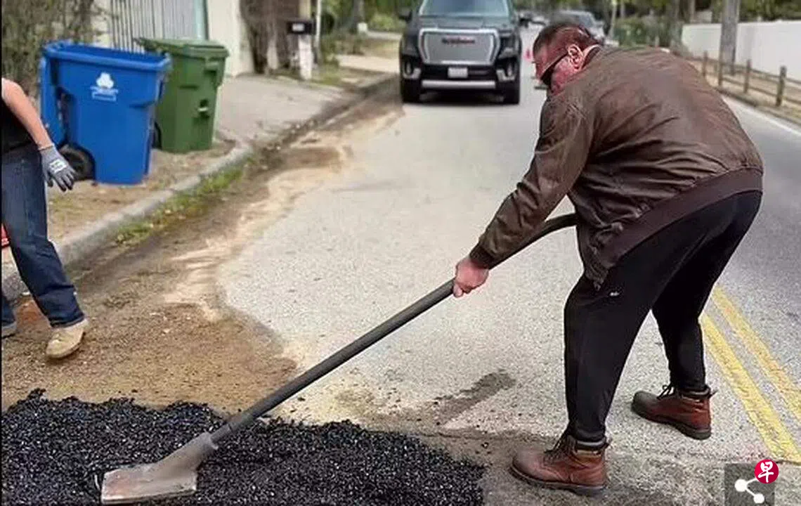 Schwarzenegger给视频加了这样的文字说明:“整个社区都对这个巨大的坑洞感到不满,今天,它已经损坏了好几辆汽车和脚踏车,我带着我的团队出去把它修好了。我总是说,不要抱怨,要做点什么。就是这样。”