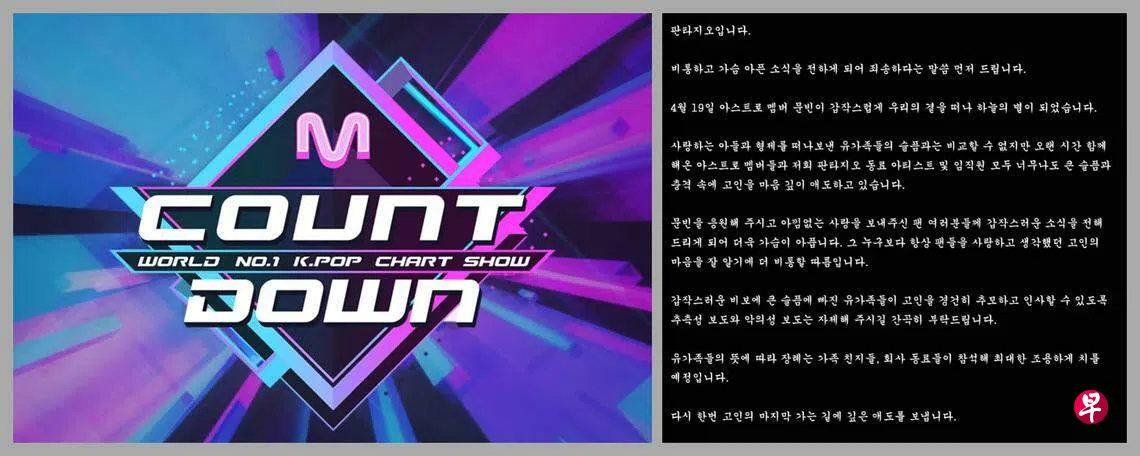 (综合讯)早前报道,韩国男团ASTRO的成员文彬(Moon Bin)在住家身亡,得年25岁。经纪公司Fantagio在凌晨发出正式声明证实死讯。