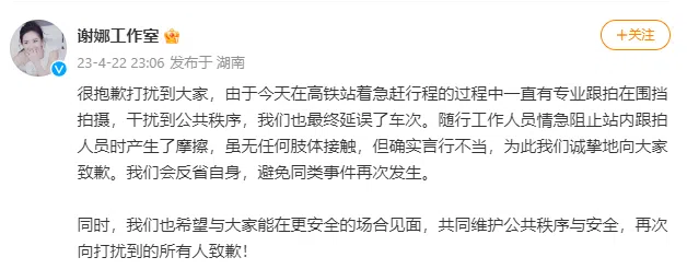 谢娜工作室星期六(22日)晚上火速发文道歉,称在高铁站着急赶行程的过程中一直有专业跟拍在围挡拍摄,导致他们延误了车次,随行工作人员情急阻止站内跟拍人员时产生了摩擦,“我们诚挚地向大家致歉,会反省自身,避免同类事件再次发生。”