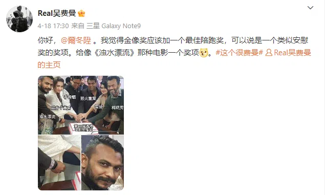 今年4月,赛前呼声颇高的吴镇宇六度错过香港金像奖影帝宝座,儿子在微博“酸”爸爸:“恭喜无蒸鱼获得最佳陪跑和最佳冷门奖”,还标记尔冬升导演“建议应该加一个最佳陪跑奖,可以说是一个类似安慰奖的奖项。给像《浊水漂流》那种电影一个奖项。”