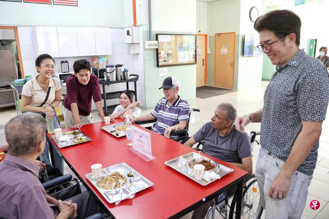 新剧《送餐英雄》主要演员许瑞奇、何盈莹、苏梽诚和胡煜诗星期一(5月15日)下午到位于义顺的瑞那拉耶拿教会(Sree Narayana Mission)养老院送餐,亲切跟老人互动。