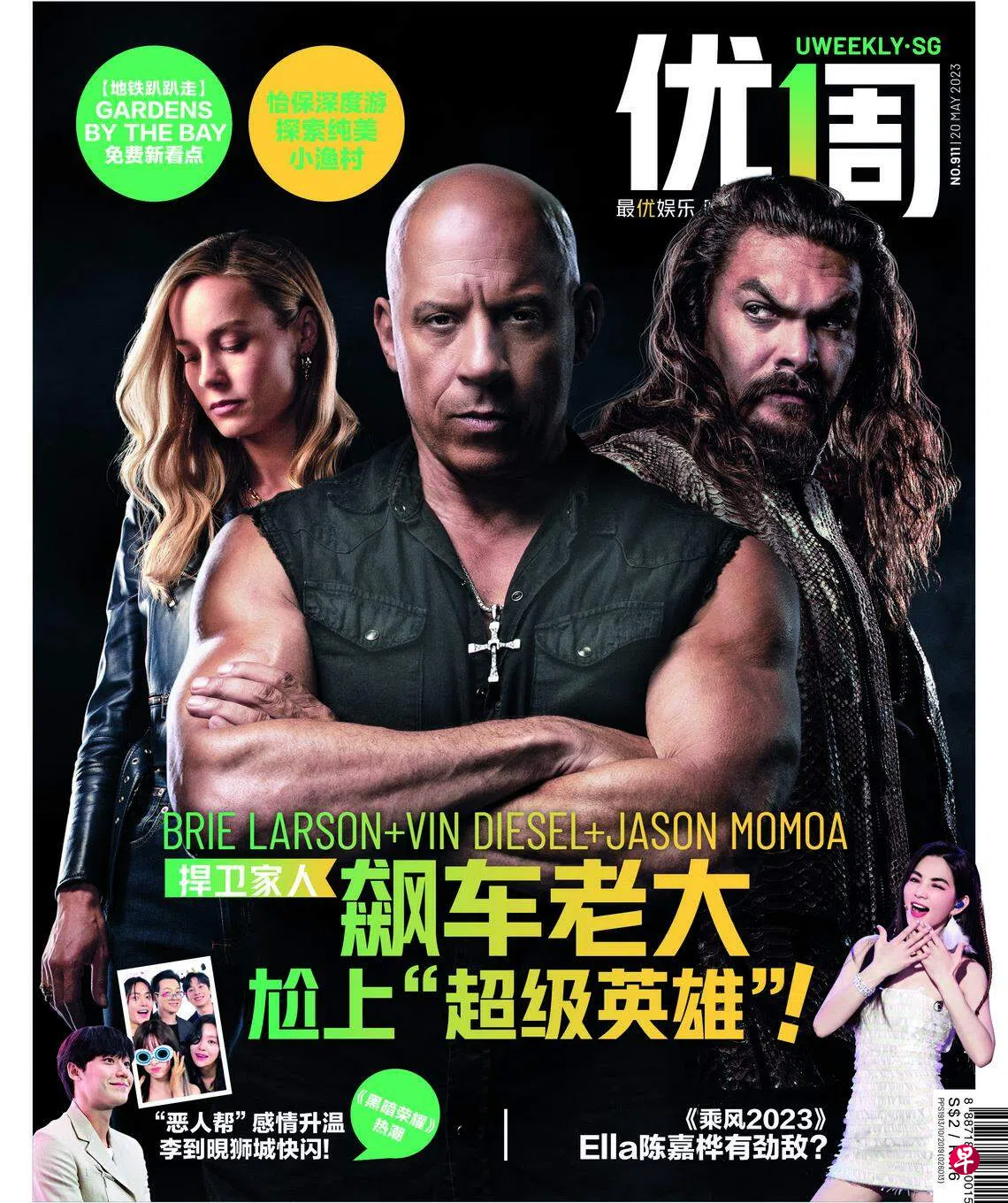 (本地讯)第911期《优1周》在周五(19日)出街,本期的封面人物是和《优1周》一样“诞生”于22年前的《玩命关头》系列的55岁元老级成员Vin Diesel(范迪塞尔),以及新成员Jason Momoa(杰森莫玛)和Brie Larson(布丽拉尔森)。已在本地热映中的第10集《玩命关头X》(Fast X Fast & Furious 10),彻底考验男主角兼制片范迪塞尔的毅力和耐力,因为他必须在两位漫画超级英雄“水行侠”和“惊奇队长”的挑衅和协助下,完成保护家人的艰巨任务!
