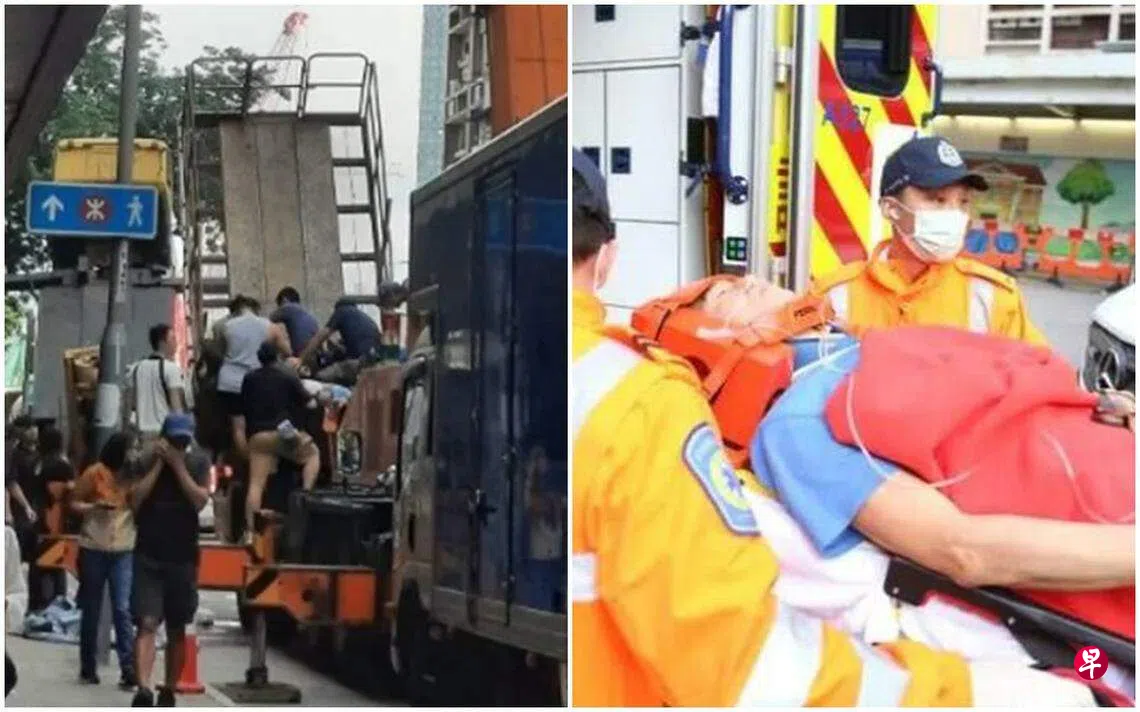 香港媒体报道,电影剧组20日在九龙城街道上拍戏,几名工作人员在升降台上,升至酒店四楼,准备从半空中打光。但吊臂车突然往后倾斜,导致升降台急速下坠,令多名人员摔落。事发后消防和救护人员赶紧到场救援,有两名摄影师及六名助理受伤,其中有一人骨折和一人昏迷,地上血迹斑斑。昏迷伤者分送伊利沙伯医院及广华医院,急救后已甦醒。
