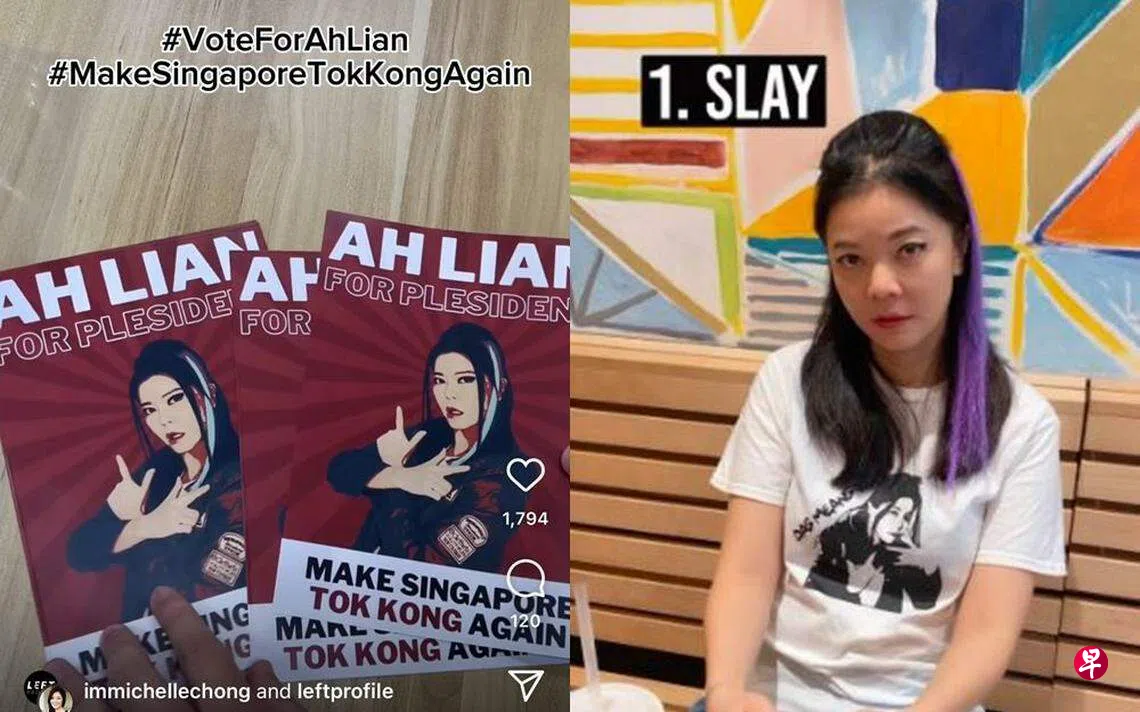 庄米雪6月13日在IG分享短视频,视频中可见阿莲的竞选传单,传单上印了阿莲的头像和竞选标语“Make Singapore Tok Kong Again”(再让新加坡发威)。仔细看传单,会发现大标题印上“Ah Lian for plesident”而不是“president”(总统),幽了网民一默。