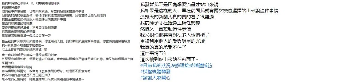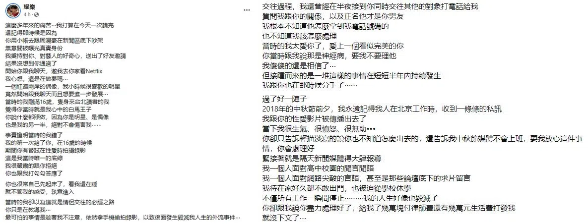 据耀乐描述,他当年刚满16岁,视对方为心目中的白马王子,“事实证明当时的我错了,我的第一次给了你,在16岁的时候,期间你有尝试在性爱时拍摄录影,这是我当时唯一的底线,我很严肃的拒绝你,你也跟我打勾勾答应了。”但最后对方还是偷偷拍摄,不雅视频还流出了。