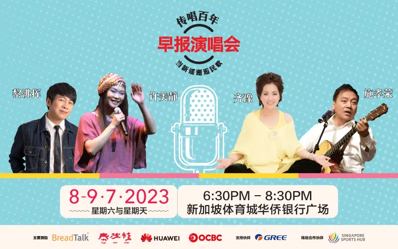 早报演唱会“传唱百年——当新谣邂逅民歌”7月8日和9日(星期六、星期日),傍晚6时30分至晚上8时30分,在新加坡体育城华侨银行广场举办。参与歌手有齐豫、施孝荣、黎沸挥、许美静、麦克疯等。
