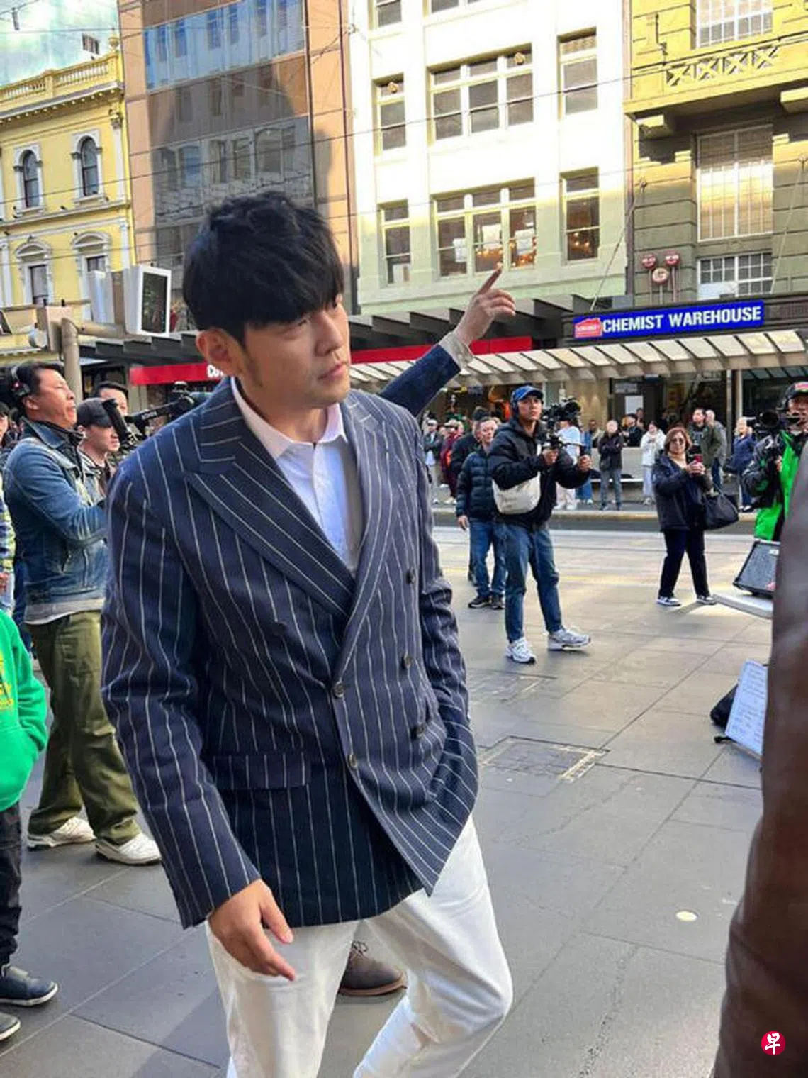 (台北讯)现年44岁的周杰伦日前被网友在外国目击参与节目拍摄,真实颜值随即曝光。当天周杰伦身穿条纹西装内搭白色衬衫,虽然造型时尚,不过其真实颜值让人难以恭维。