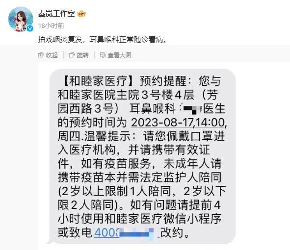对此,秦岚工作室晒出预约看诊的截图,表示她是“拍戏咽炎复发,耳鼻喉科正常随诊看病”,否认了怀孕臆测。