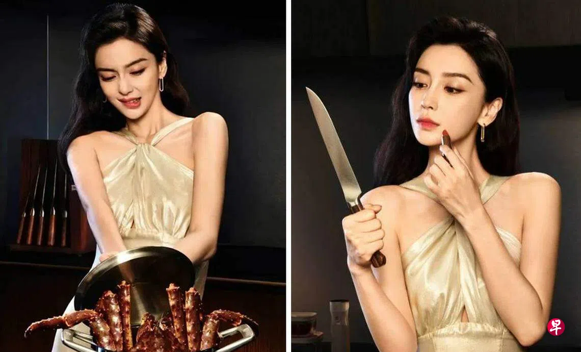 黄晓明之前把锅底当镜子,还用厨房刀刮胡子,杨颖则用厨房刀当镜子涂口红,还咬唇凹肩,扭着身子拿锅盖试图把一只帝王蟹煮了。先不说代言海报多么没有烟火气,单看杨颖咬唇样子就让网民想到黄晓明,直言她学到前夫精髓,油腻得如出一辙。