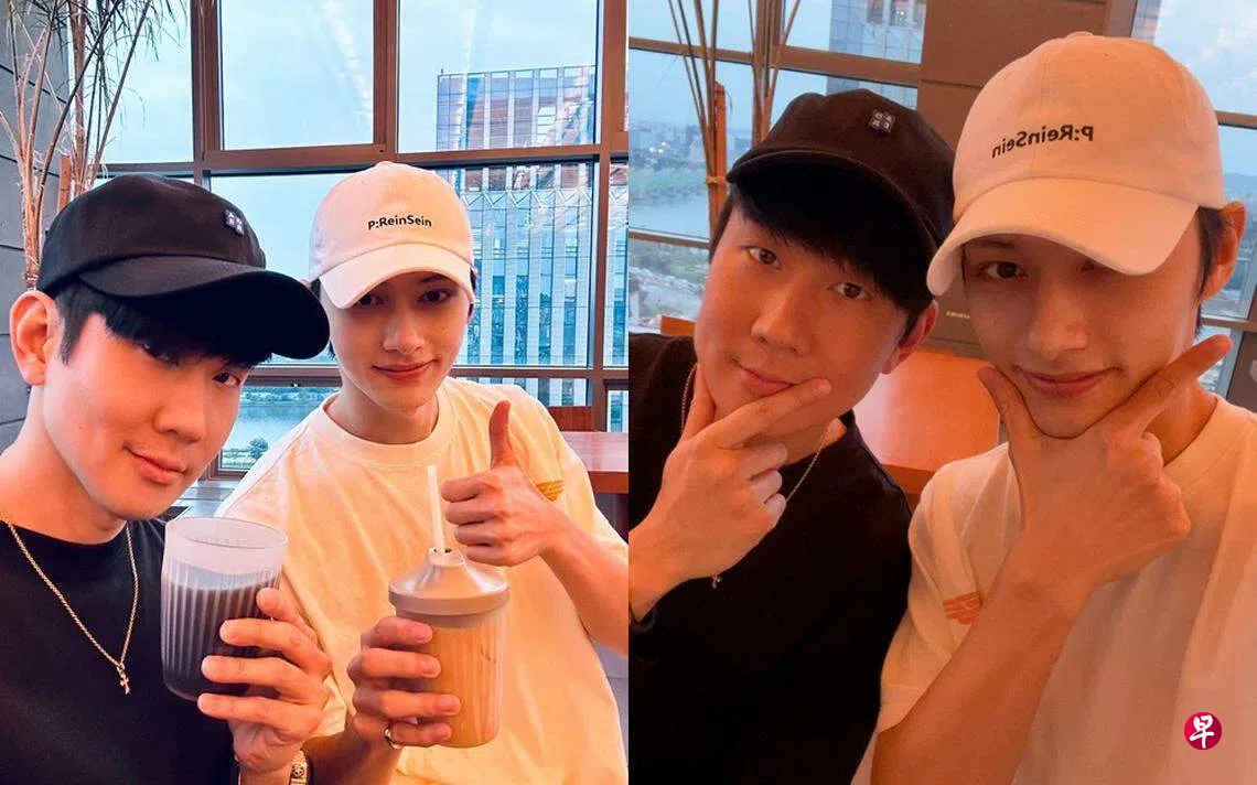 照片中,林俊杰戴着黑色鸭舌帽,身穿同色系上衣,文俊辉则是头戴白帽、穿着白T,两人不约而同地拿着饮品一起入镜,称呼对方是新的喝咖啡伙伴。