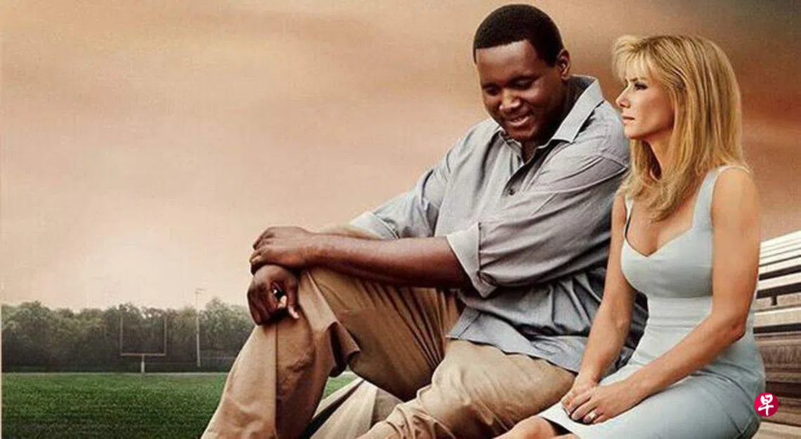 Bullock才痛失伴侣后不久,她在2009年的一部体育电影《盲点》(The Blind Side)就爆出争议。该片改编自黑人美式足球员迈克尔奥赫(Michael Oher)的故事。Oher从小无家可归,庞大的身躯和木讷的性格让他辗转于各个寄宿家庭之间,备受嫌弃,直到他在高中时遇到了Tuohy太太一家,生平第一次感受到了亲情。在这家人的帮助下,他很快就找到自己擅长的事情,成为美国家喻户晓的美式足球明星,收获幸福的人生。