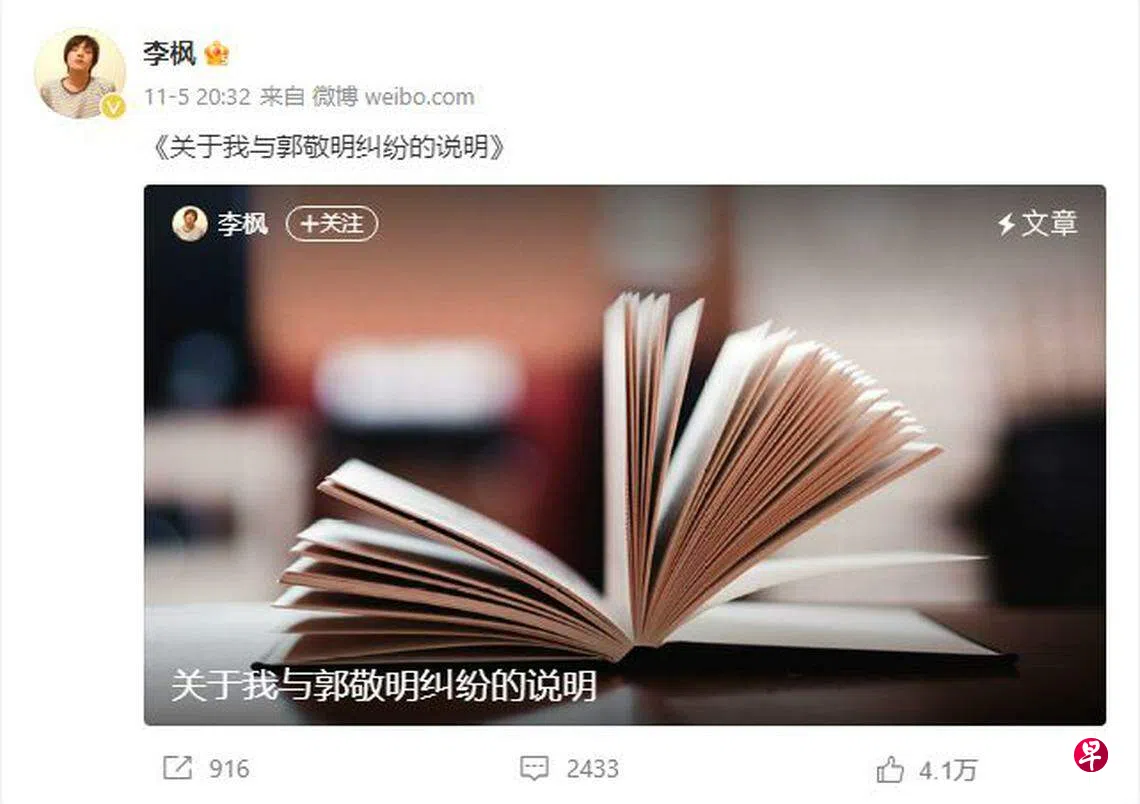 (北京讯)近日,中国作家李枫的在社媒的一篇自述长文在网上掀起轩然大波,李枫发布的文章《关于我和郭敬明纠纷的说明》,讲述了昔日自己曾遭遇郭敬明性骚扰的经历。