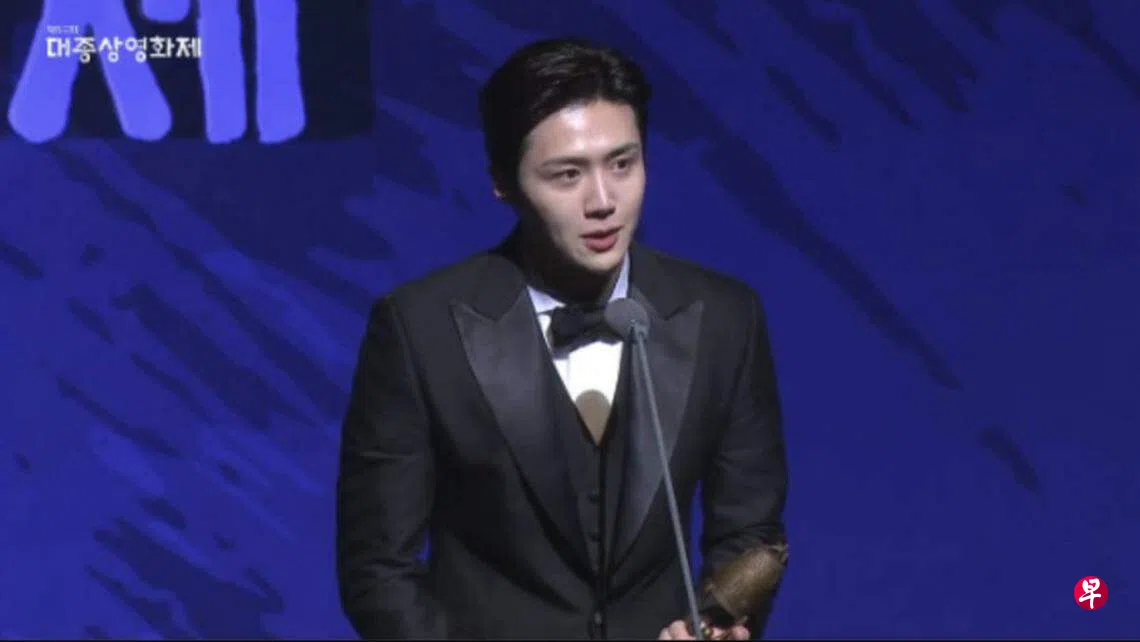 金宣虎以《贵公子》首度进军大银幕,演活“干净的疯子杀手”,反转形象令人惊艳,10月刚获得釜日电影奖最佳男新人演员,如今再下一城。他上台领奖时,感谢导演朴勋政伸出援手。不过他过于紧张,最后感谢父母时,连说了两次爸爸,忘了妈妈,惹笑全场,主持人幽默解围:“爸爸会非常开心。”再度引起台下爆笑。
