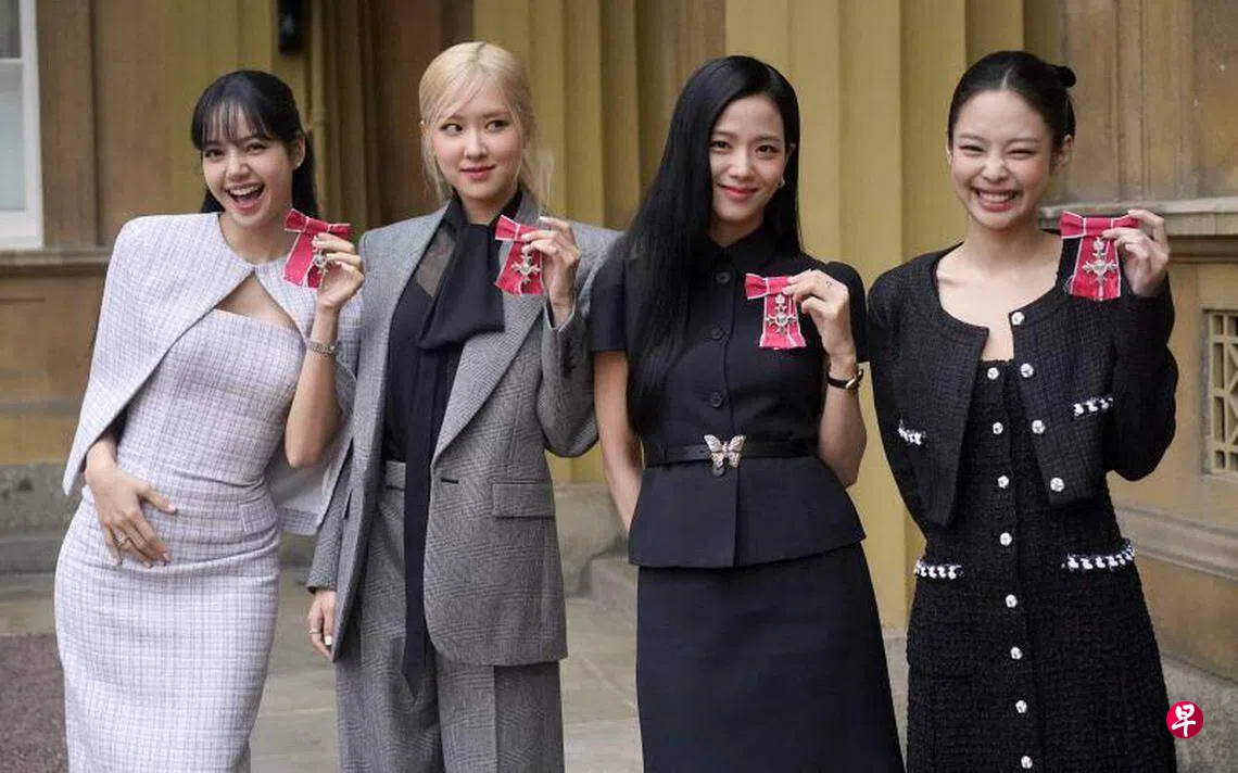 (综合讯)韩国女团Blackpink出席英王国宴并获颁勋章,英国王室11月22日在官方IG分享英王查尔斯三世授予四成员勋章的画面,表扬她们倡导环保有功。