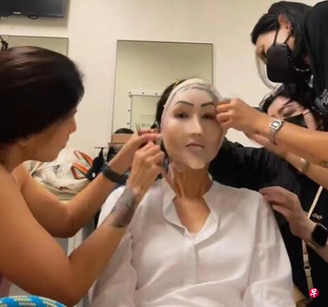 “只是不知道整个面具的制作过程,以及拍摄时要把面具黏在脸上那么费时。对我而言,在制作这个面具时会比较可怕,因为会把hard clay(硬黏土)涂在整张脸,开不到眼睛、讲不到话、只有两个鼻孔可以呼吸,等硬黏土凝固在脸上后才取下来制作出比较软状的面具。在那段时间,如果有什么状况,我不知道要怎么沟通,所以我有叫我老公来陪我。如果有什么事情发生,我老公能明白我做出的手势。整个制作过程长达两个小时。”