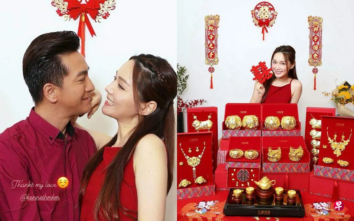 汤洛雯星期三(29日)晒出过大礼仪式的照片,除了各类礼篮,最吸睛的莫过于龙凤镯、金手镯、金项链等,排得满桌满地,她自己都吃惊:“长这么大第一次见到好像流星锤的龙凤镯。”
