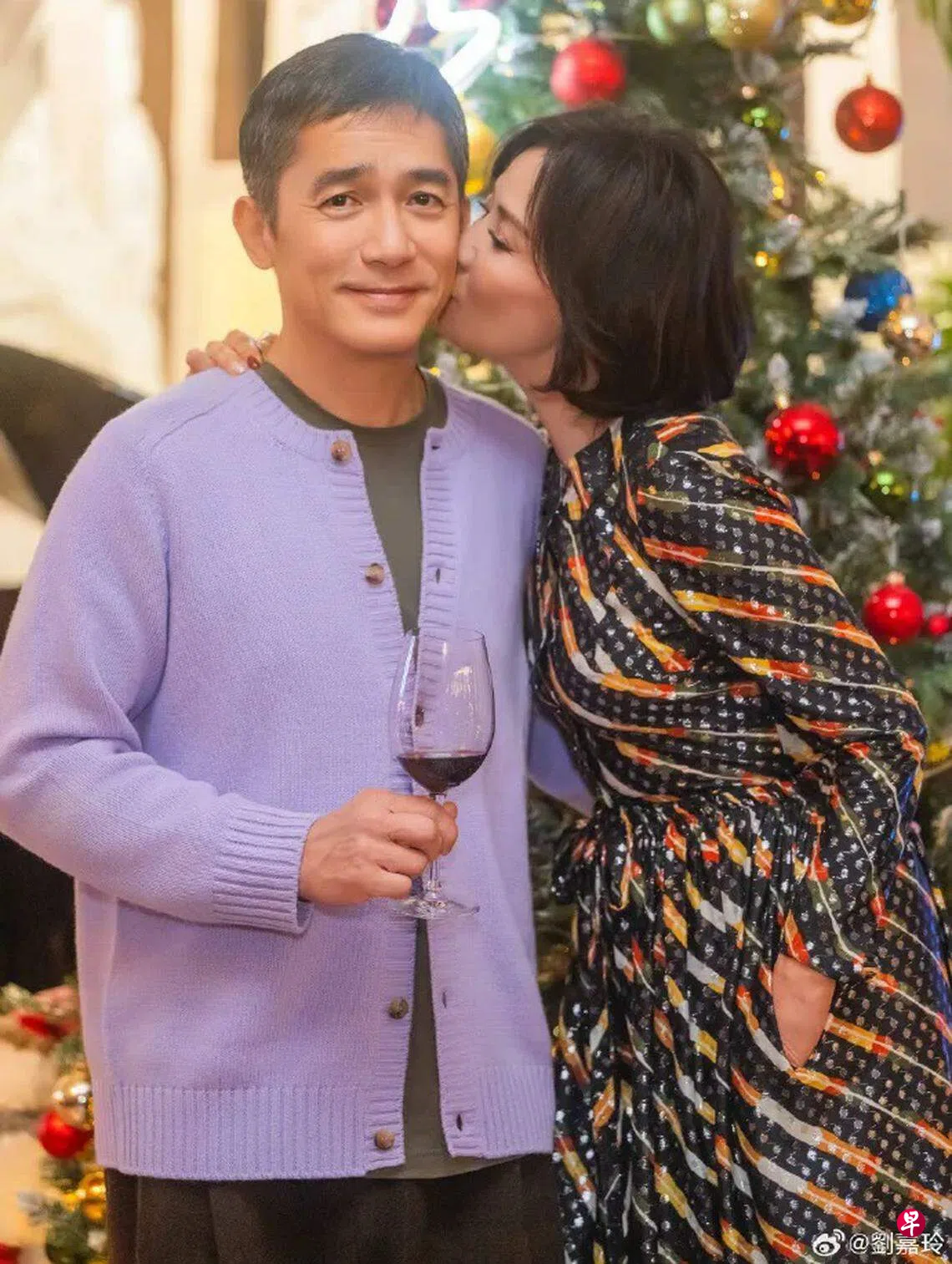 刘嘉玲在社媒分享圣诞节派对照片,梁朝伟穿着紫色针织衫,手上拿着酒杯看向镜头,笑容相当腼腆,刘嘉玲一身花色洋装,手搭在老公肩上献吻他的侧脸,画面充满粉红泡泡。派对上还能看见吴君如与陈可辛夫妇,同时还有其他艺人朋友。