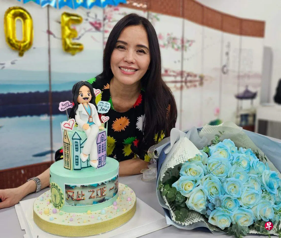 这个在安老院内举行的温馨生日会,其中一个亮点就是粉丝会送上精巧的翻糖蛋糕,蛋糕以阿姐在《只此一家》中的酷形象为造型,惟妙惟肖。阿姐告诉《联合早报》,粉丝会中有一个烘焙功夫了得的女粉丝,过去曾为她亲手制作不少精致的翻糖蛋糕,让她非常感动。对方和她竟然都在同一天生日!