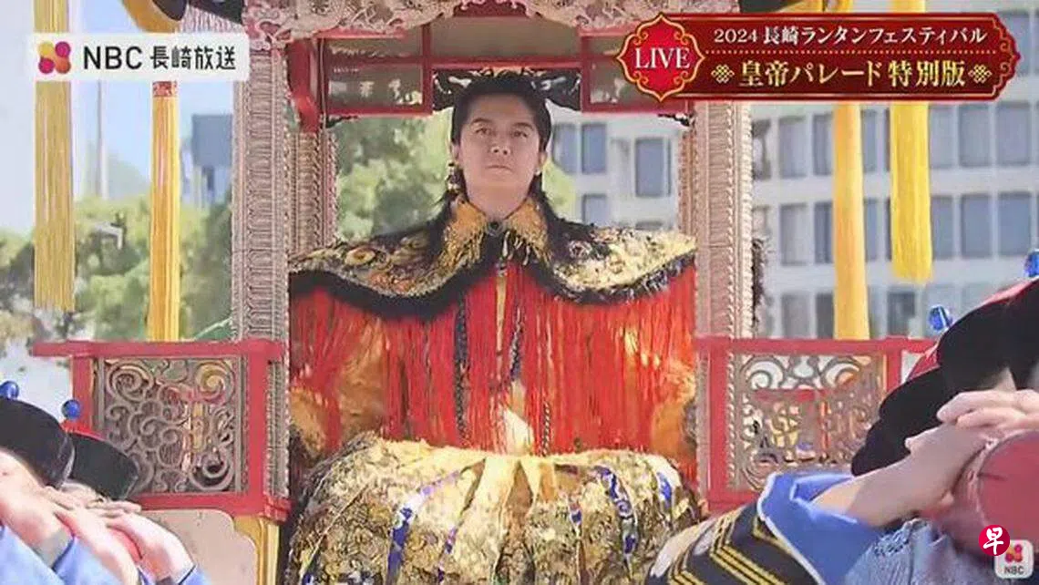 福山雅治(Masaharu Fukuyama)17日现身家乡日本长崎,参加当地中华街的2024年灯会活动,与同家乡出身的女艺人仲里依纱(Riisa Naka),扮成中国清朝皇帝与皇后,展开特别版的“皇帝游街”。不同于日本明星装扮历史名将骑马,二人坐在22人抬着的大轿游行,现场人山人海。