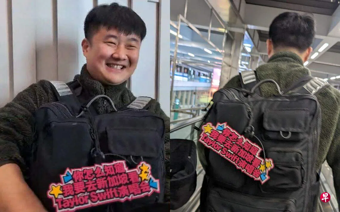 美国流行天后Taylor Swift(泰勒丝)的新加坡演唱会3月2日将展开,一名刘姓读者向《联合早报》爆料,星期四(2月29日)晚上在北京首都国际机场碰到一名粉丝,他的背包上挂着一个特制牌子,写着:你怎么知道我要去新加坡看泰勒丝(Taylor Swift)演唱会?”。