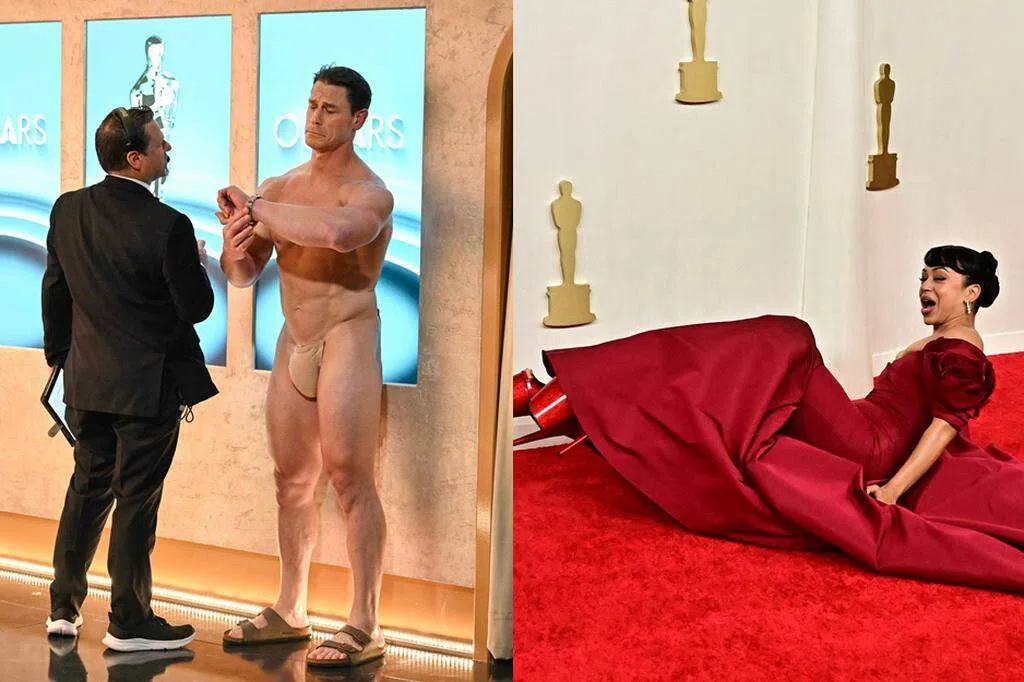 典礼上,主持人Jimmy Kimmel(吉米金莫)在台上提及1974年有裸男乱入舞台的事件,问道:“如果现在有裸男突然冲上台,你能想像吗?”随后镜头转向后方,惊见John Cena(约翰·塞纳)近乎裸体现身舞台。