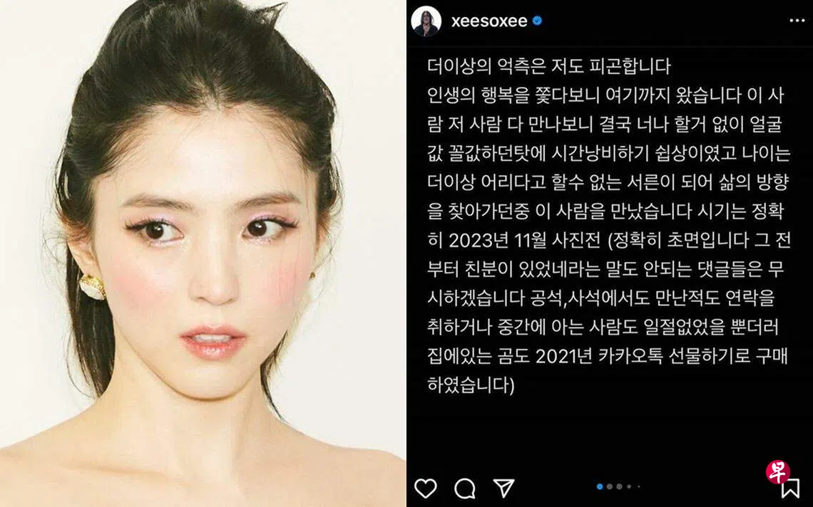 韩韶禧在已删除的IG文中,再次强调自己和柳俊烈(Ryu Jun-yeol)的感情并非无缝接轨,并指惠利先前在道歉信中提到11月与柳俊烈见面,并非为了重逢,而是为了作最后道别。
