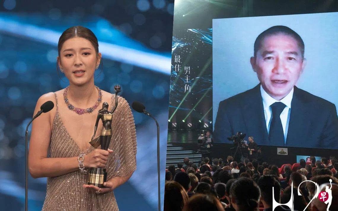 梁朝伟凭《金手指》的枭雄角色第12次入围香港电影金像奖最佳男主角,并六度拿下影帝宝座,之前备受看好的林保怡只能望奖兴叹!这也是梁朝伟时隔19年后再夺影帝。梁朝伟因在德国拍戏缺席颁奖礼,由太太刘嘉玲代领。他通过视讯发表得奖感言,除了感谢《金手指》团队外,也感谢老婆“嘉玲姐”,以及这些年来一直支持他的观众。