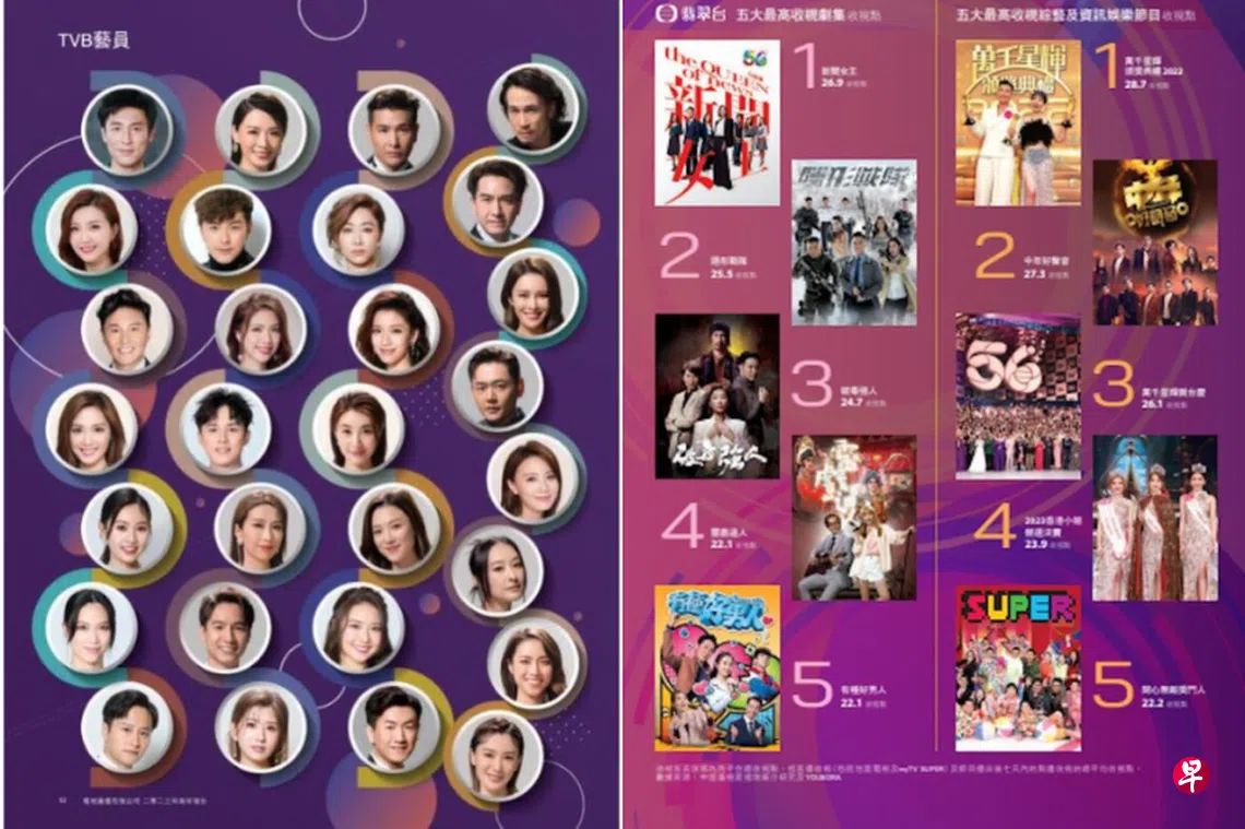 日前,TVB公布了“2023年周年报告”,当中公布了去年收视最高的剧集和综艺排名,不过,最令人关注的当然是小生花旦的排行位置,虽然近年来有不少艺人相继离开,但仍然还有不少新血的加入,根据周年报告,即使今年的艺人简介与前年2022年同样六页,但人数由168位艺人增至182位艺人。